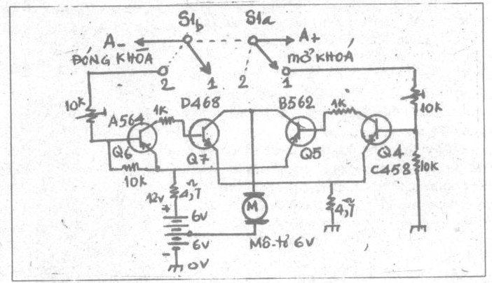 Trong sơ đồ hình 3, khi nút mở khóa (ở chìa khóa) được ấn, bộ thu nhận sóng khuyếch đại , rồi tách sóng lấy ra điện 1 chiều dương ở A+, dẫn đến phân cực cho Q4 dẫn Q5 dẫn theo. Dòng điện xuất phát từ điểm +12V qua trở 4,7 ohm, qua cực E transistor R5, qua C rồi chảy qua môtơ và trờ về điểm giữa nguồn 12V. Như vậy, môtở sẽ quay theo chiều mở khóa. Khi đóng cửa: chuyển mạch SK được bật sang vị trí (2), diện áp âm A- cũng sẽ nhận từ lệnh của chìa khóa (ấn nút K), làm cho khiển Q6 trở nên âm dẫn điện và Q7 dẫn theo. Điều này làm cho nội trở Q7 (điện trở CE) gần bằng 0, nên dòng điện qua môtơ xuất phát từ điểm giữa nguồn chảy qua Q7, qua trở 4,7ohm xuống masse trở về âm nguồn 6V. Dòng điện qua môtơ lúc này, ngược với dòng trước kia, nên môtơ quay ngược chiều để đẩy chốt cửa đóng lại. Bạn dùng môtơ cassette thông thường, bọc 1 ống cao su mỏng và mềm vào trục môtơ. Bố trí như thế nào để trục môtơ tì vào chốt cửa, nó có thể nhẹ nhàng quay để đưa chốt cửa ra vào ổ khóa dễ dàng. Cách làm này, bạn có thể xem phần cơ khí máy ghi âm casstte để nghiên cứu thêm.