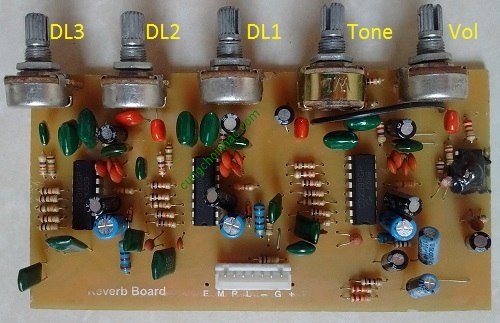 -- Do bo xài 3 IC 2399 song song , nên ta có thể không chỉnh "reverb" mà chỉnh thành echo lặp lại 3 tiếng mà không cần nút repeat...Kết quả ít bị hú !